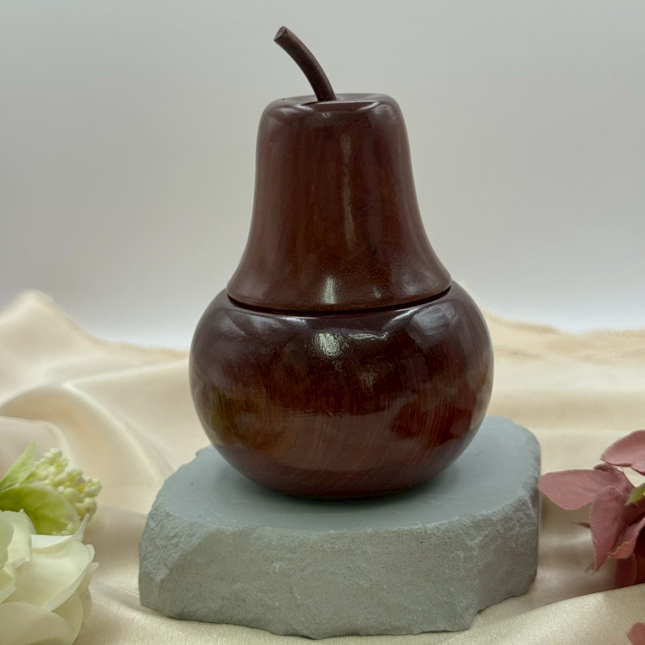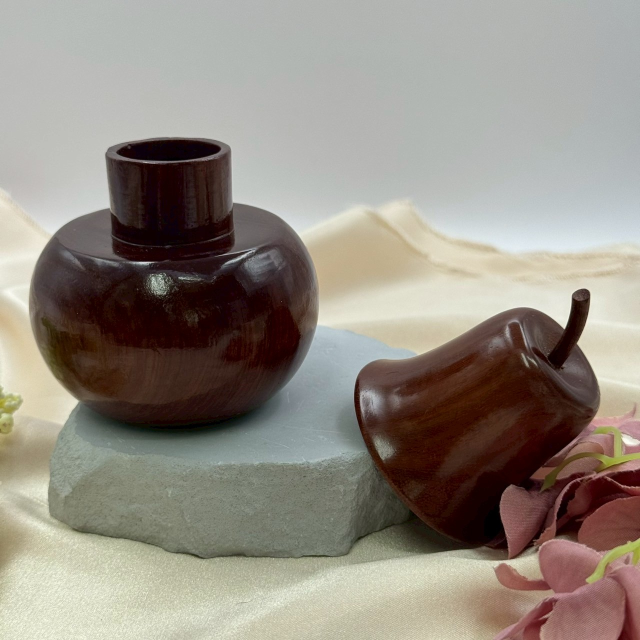 結合自然原木與手工雕製工藝,這組【原木雅器組】包含兩件特色擺件:一為圓潤的葫蘆形瓶,象徵福氣與安康;另一為仿蘋果造型的小罐,寓意平安與甜美生活。表面經細緻打磨與拋光,保留木紋天然紋理與色澤,呈現溫潤細膩的質感,是品味與雅致的象徵。